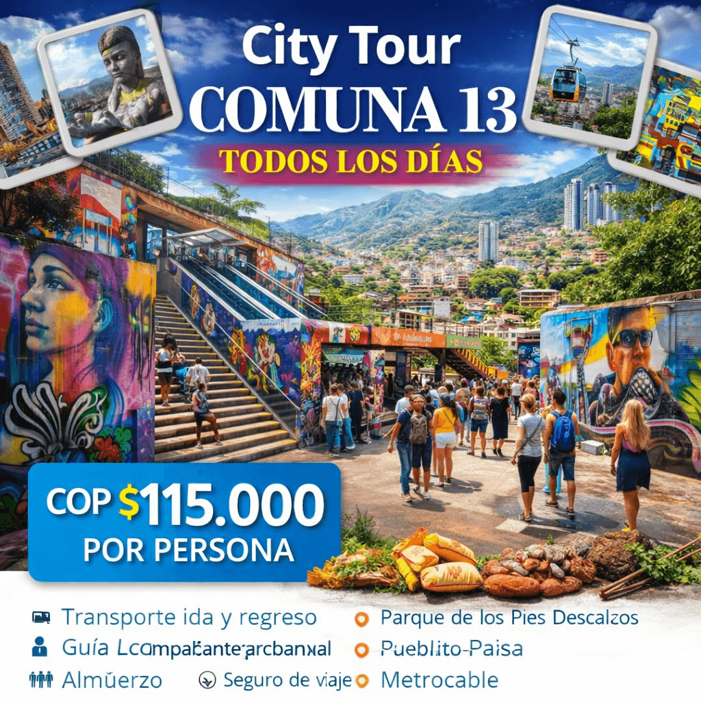 Durante el recorrido visitarás lugares emblemáticos como parques, plazas, zonas tradicionales y espacios culturales, además de hacer el famoso tour por la Comuna 13, donde podrás apreciar sus escaleras eléctricas, murales y grafitis, acompañados por guías locales que narran la historia del sector.