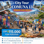 $115,000City Tour Comuna 13 en Medellín con transporte ida y regreso, guía acompañante, almuerzo y seguro de viaje incluidos. Recorre los principales sitios turísticos de la ciudad y vive la experiencia cultural de la Comuna 13 con sus escaleras eléctricas y grafitis. Disponible todos los días.