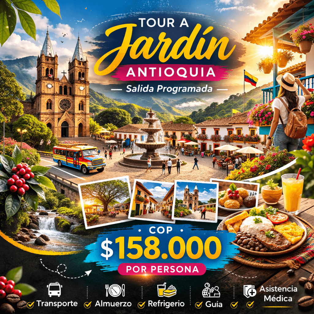 Vive una experiencia inolvidable con nuestro Tour a Jardín, Antioquia, uno de los pueblos más coloridos y encantadores del suroeste antioqueño. Este plan es ideal para quienes desean desconectarse de la ciudad y disfrutar de paisajes naturales, arquitectura tradicional y cultura cafetera.